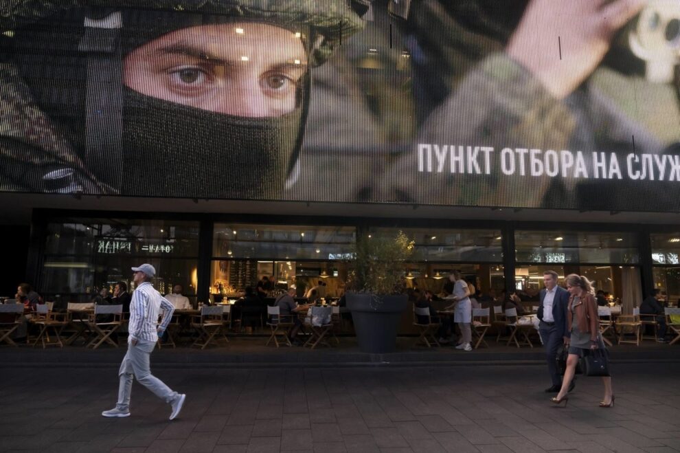 People walk past a street side cafe with an army recruiting screen calling for a contract for service in the Russian armed forces, in the center of Moscow, Russia, Thursday, Sept. 28, 2023.